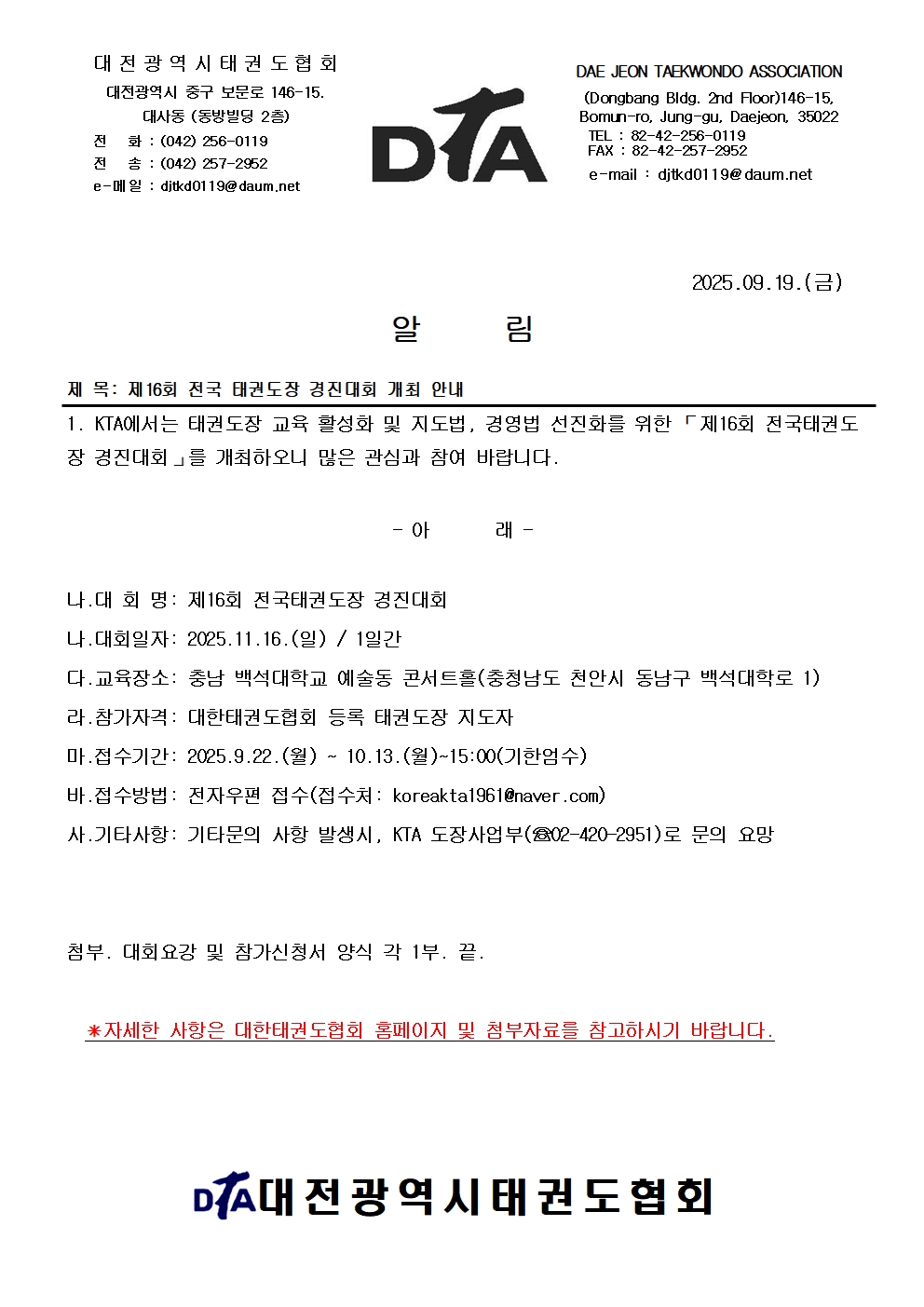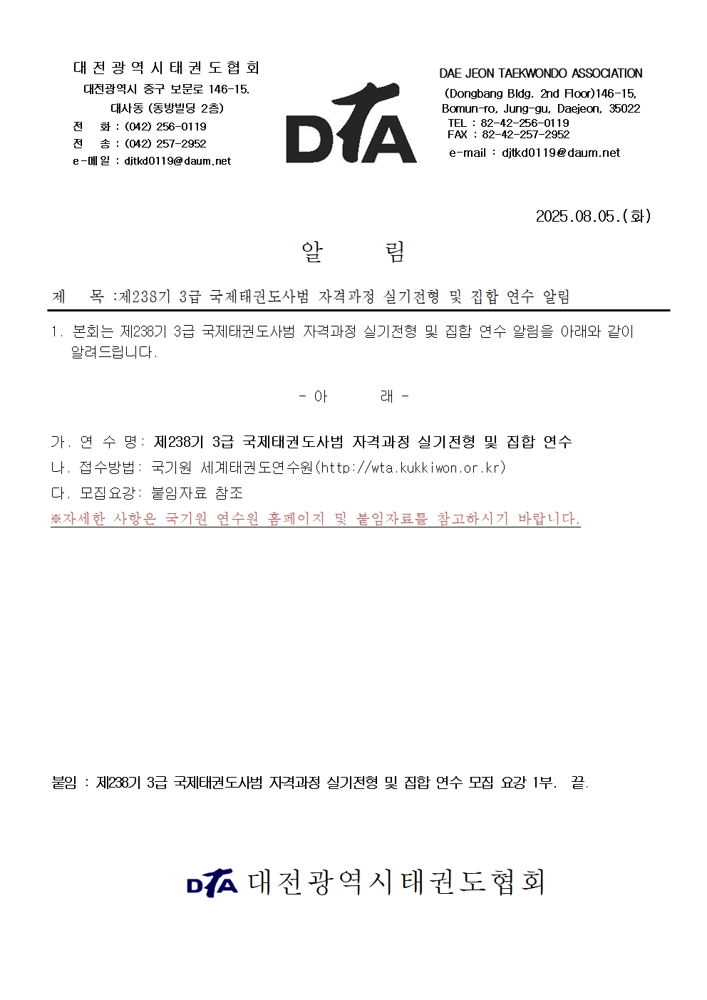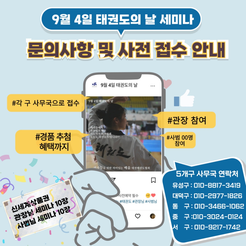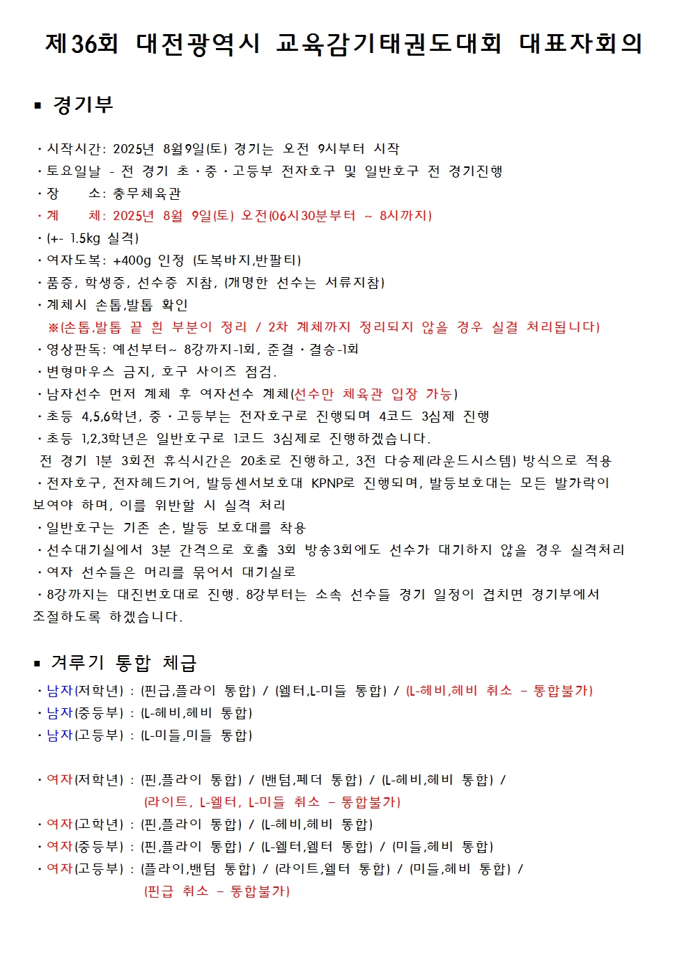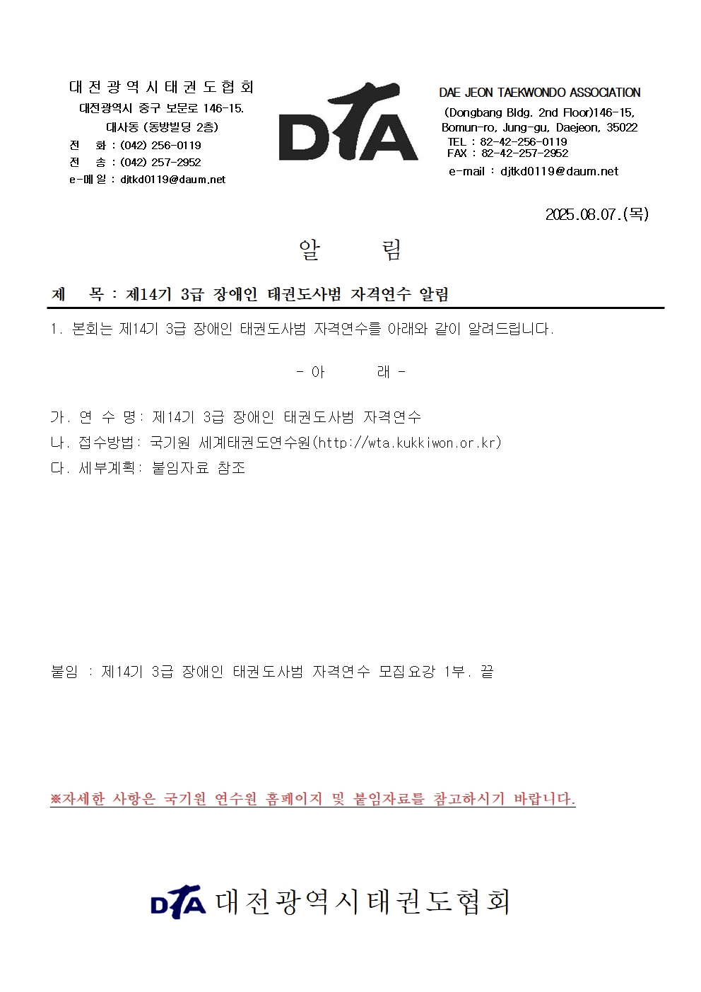| 공지 | ![]() | 대전시태권도협회 | 138082 | 2022년 2월 15일 |
