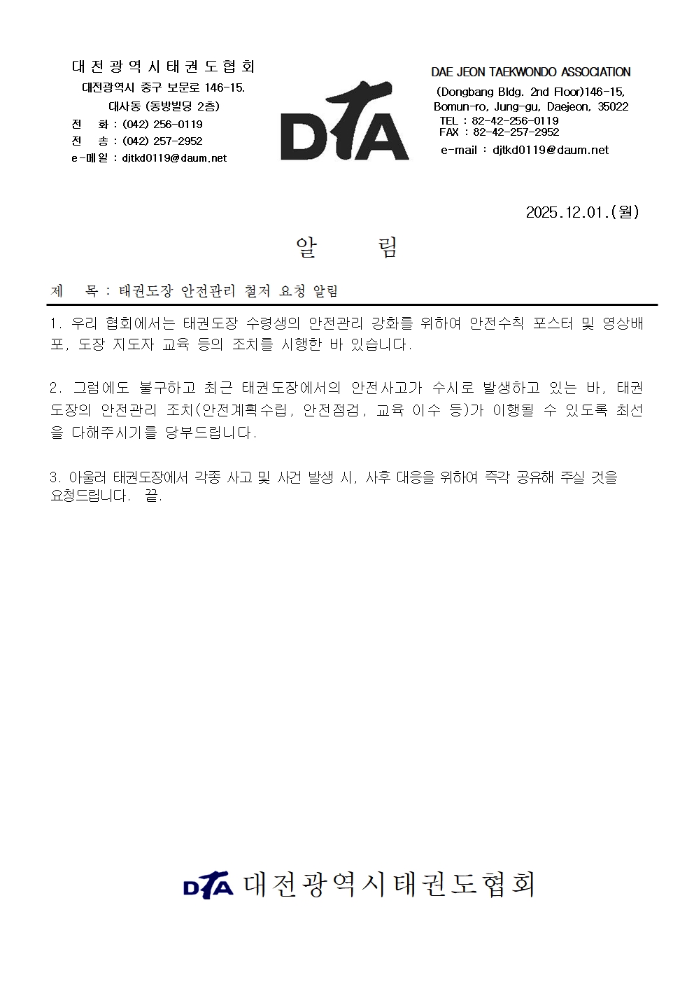 | 공지 | ![]() | 대전시태권도협회 | 120890 | 2022년 2월 15일 |