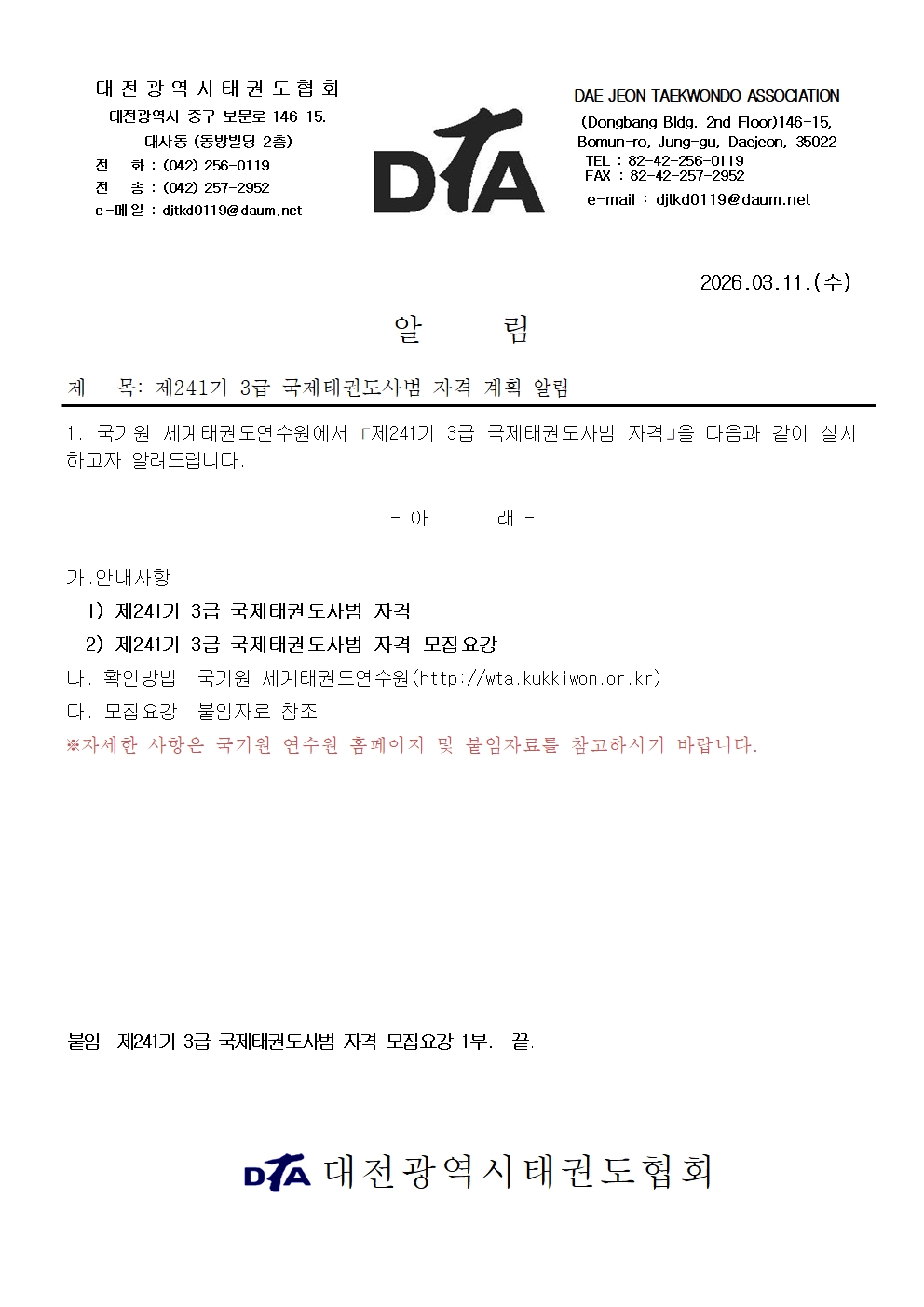 | 공지 | ![]() | 대전시태권도협회 | 136154 | 2022년 2월 15일 |