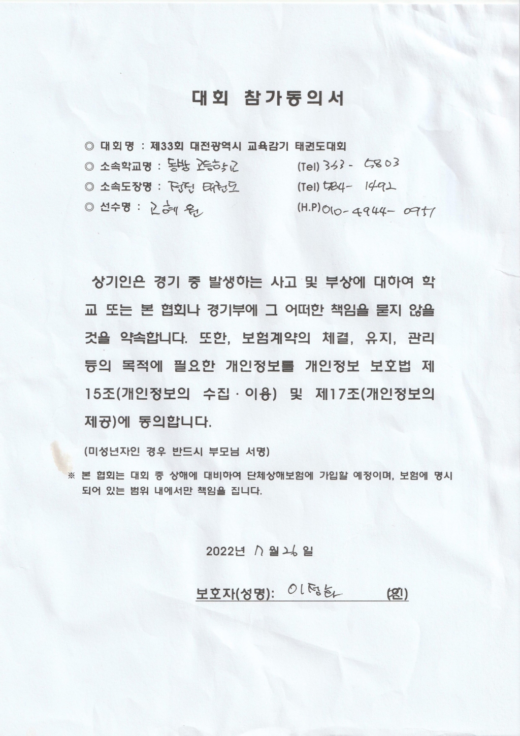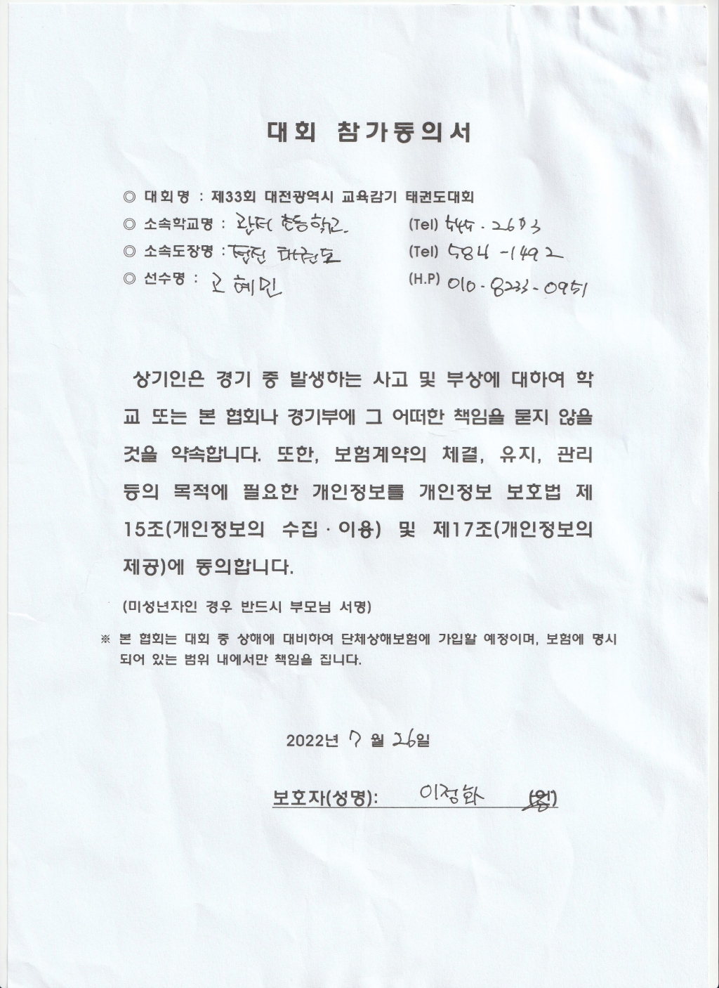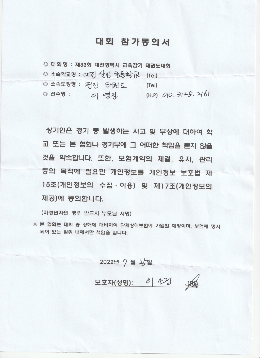 | 415 | 하나 태권도장 참가동의서 l c | 하나 태권도장 | 5 | 2022년 7월 28일 |