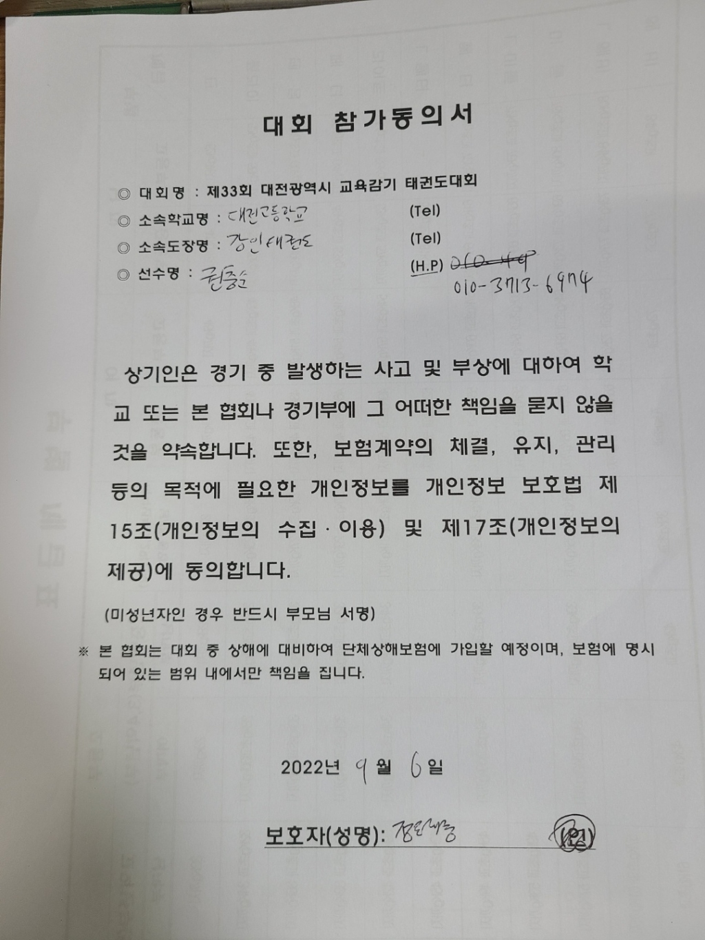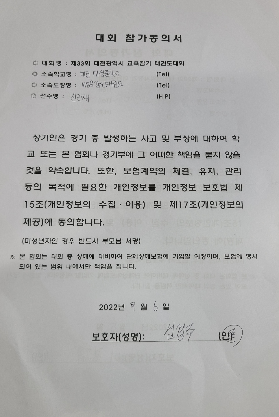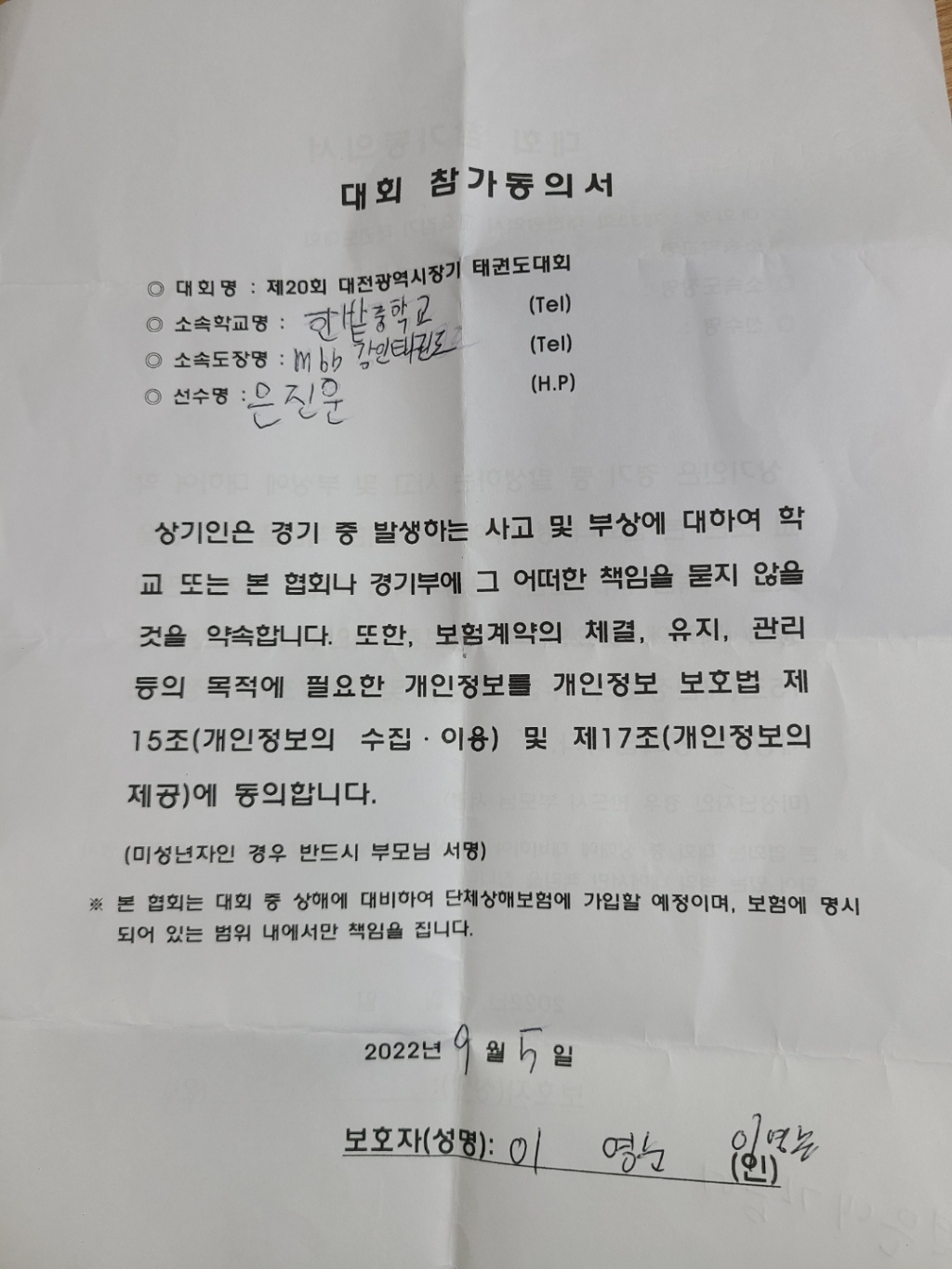 | 494 | 용인대다사랑태권도 대전시장기대회 참가동의서입니다. l image | 용인대 다사랑태권도 | 14 | 2022년 9월 7일 |