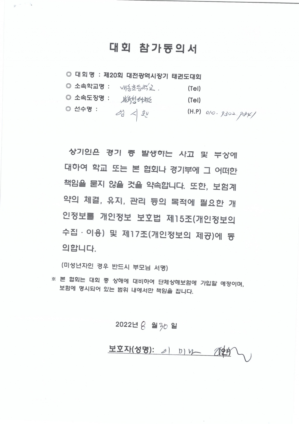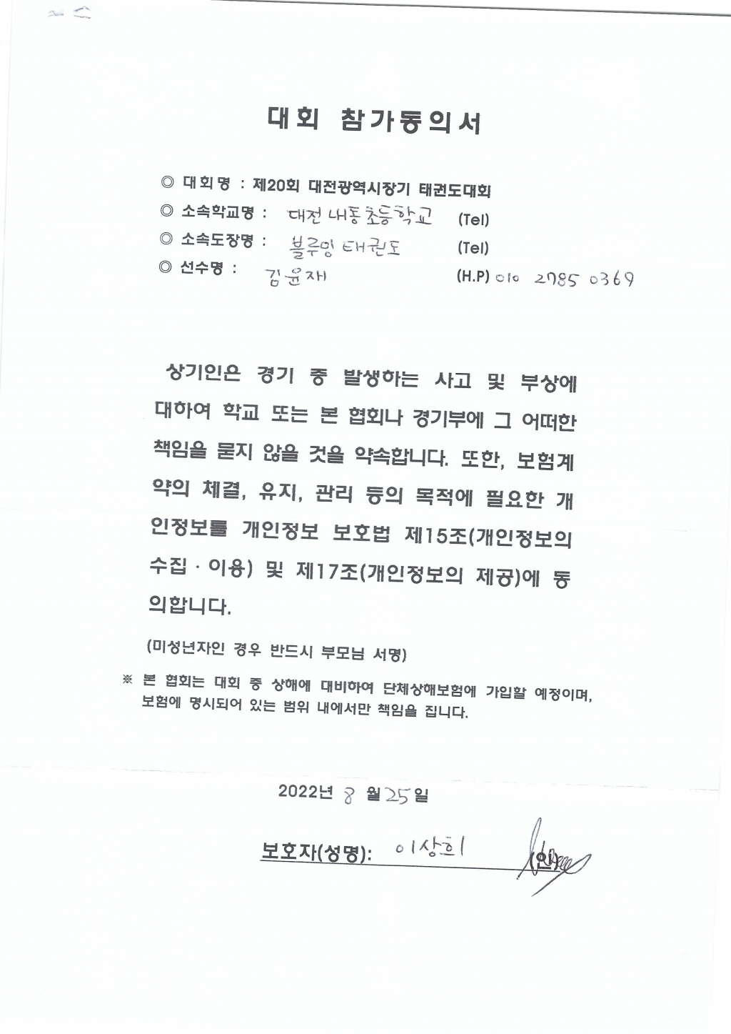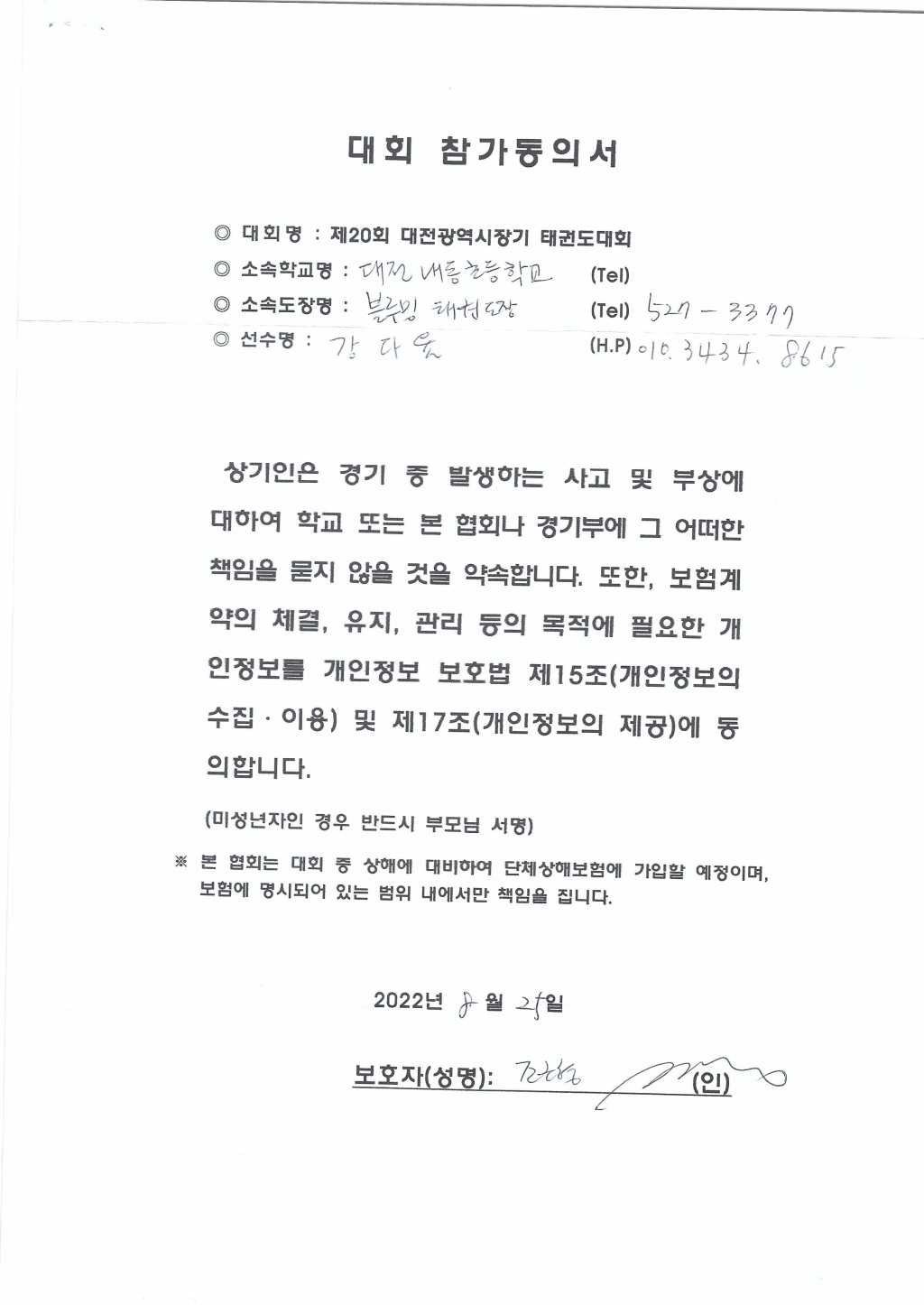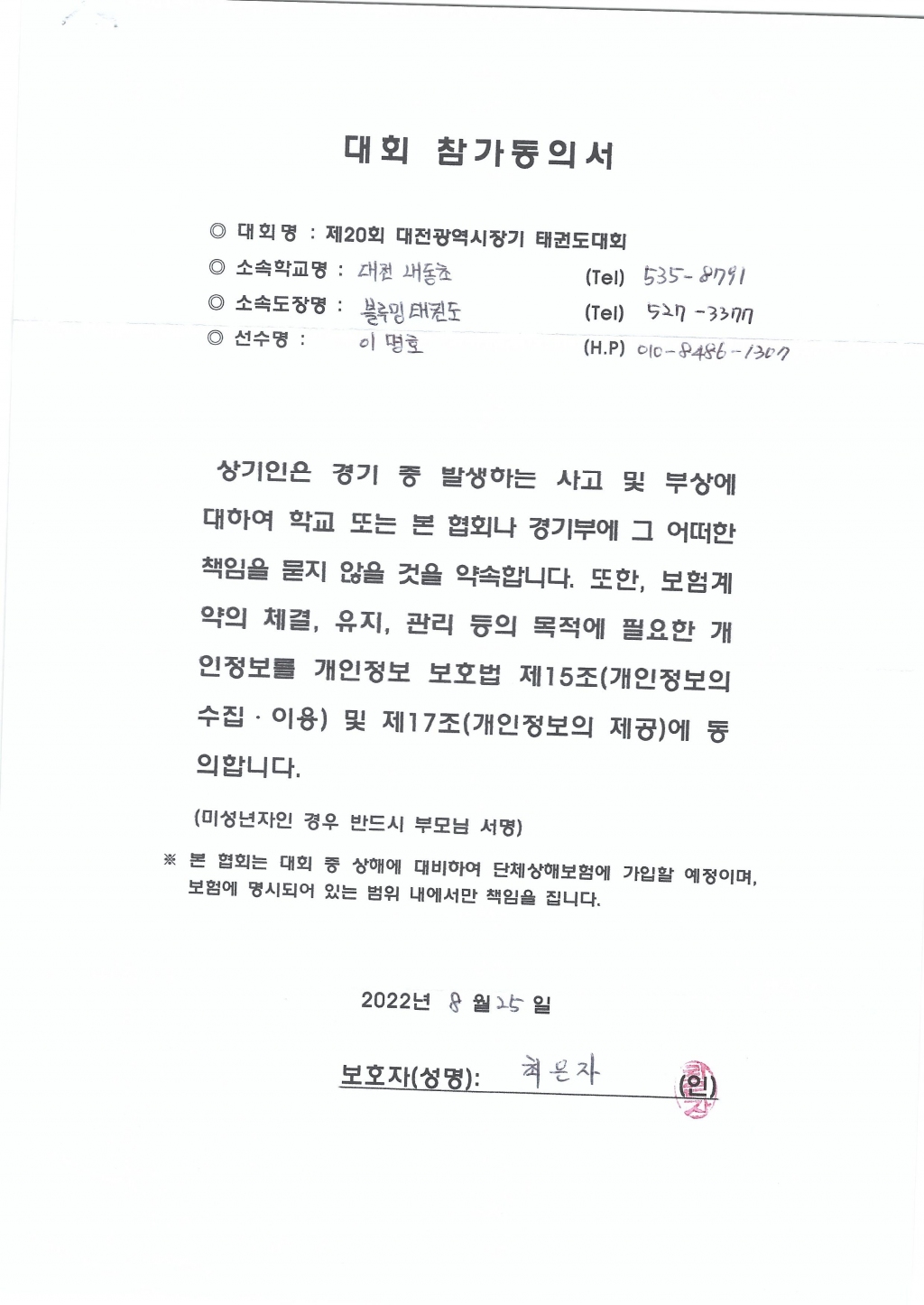 용인대다사랑태권도 대전시장기대회 참가동의서입니다. l image