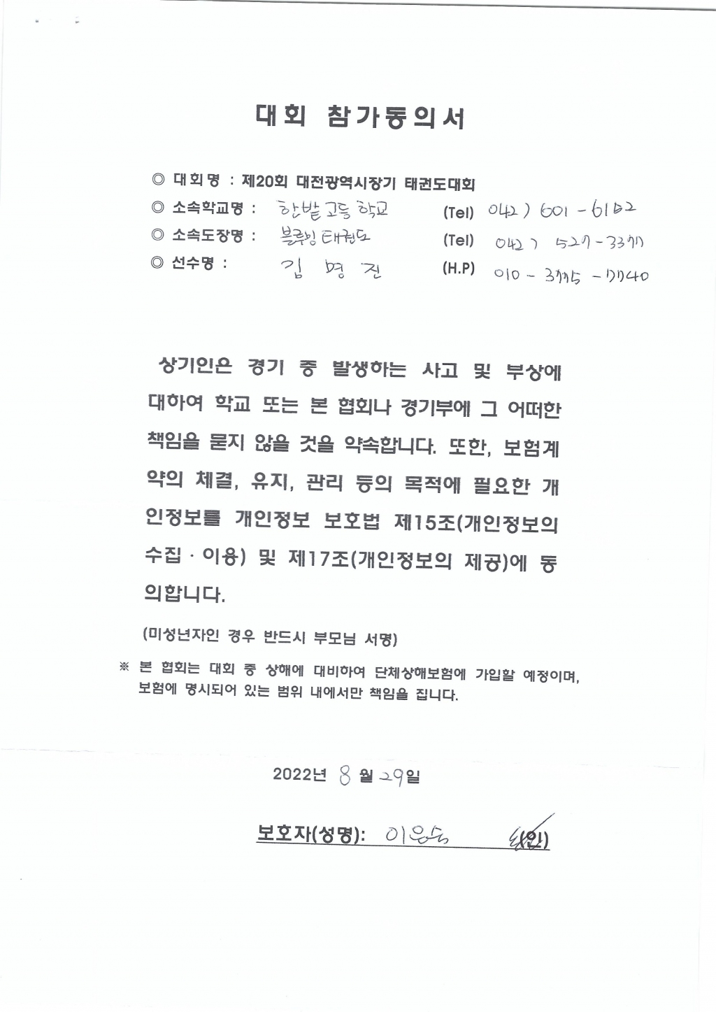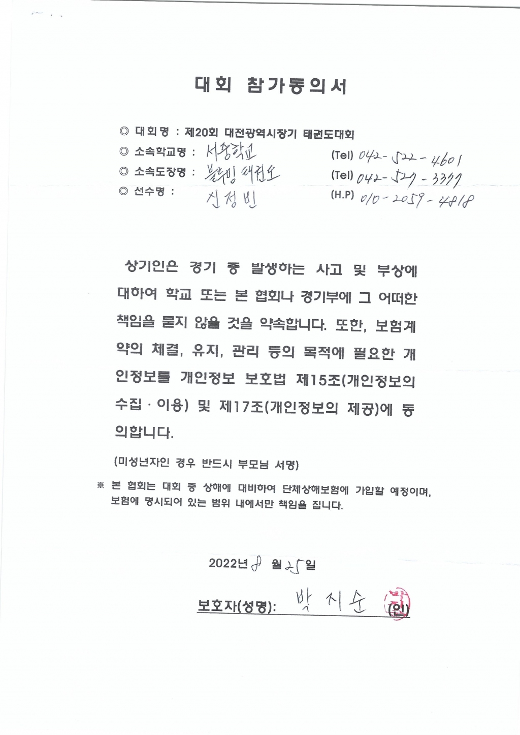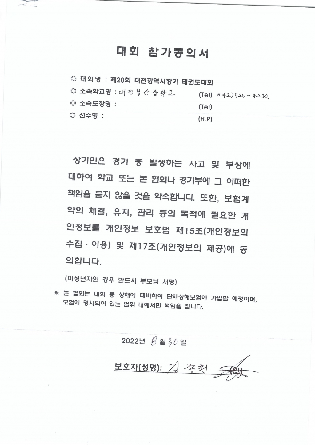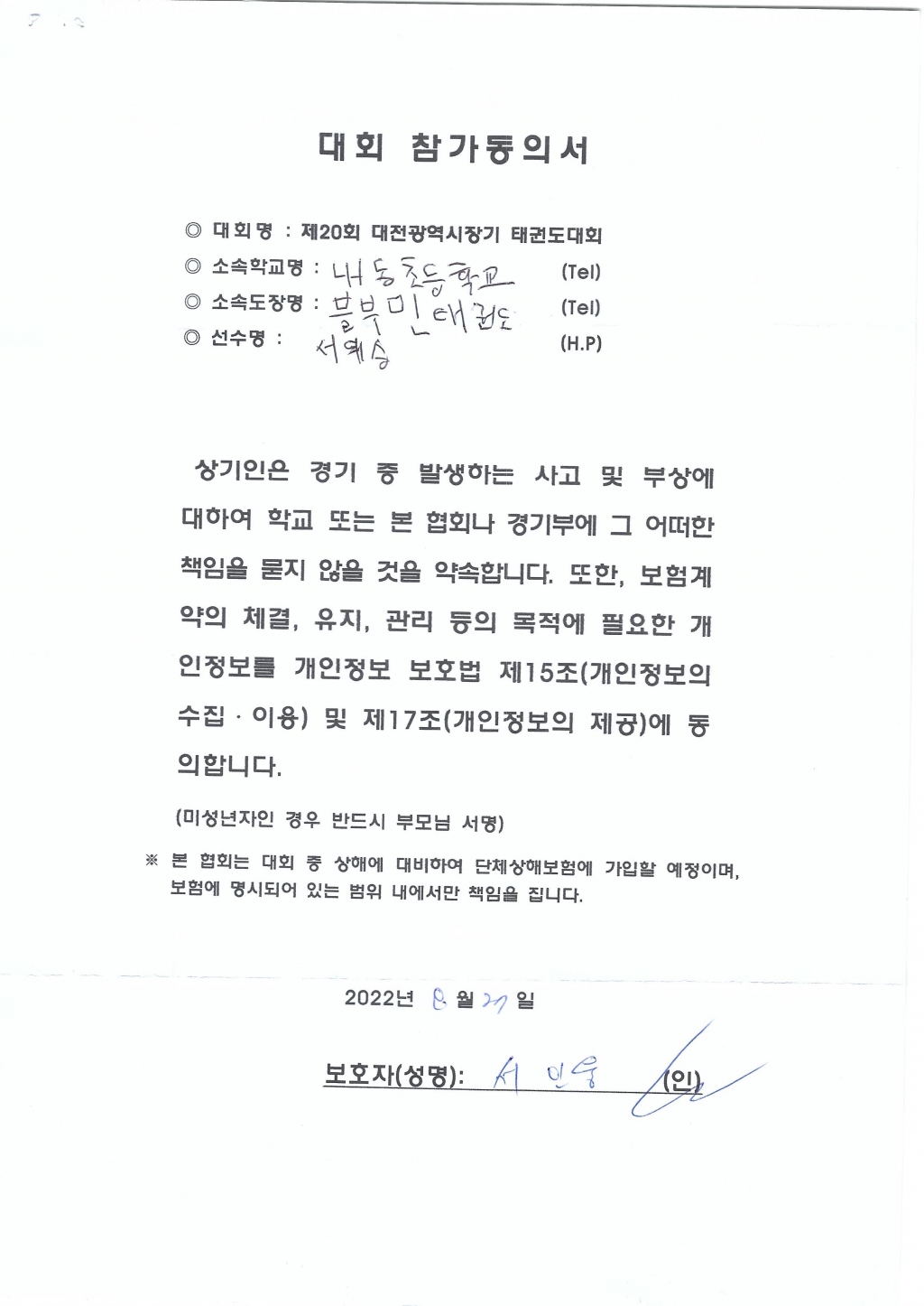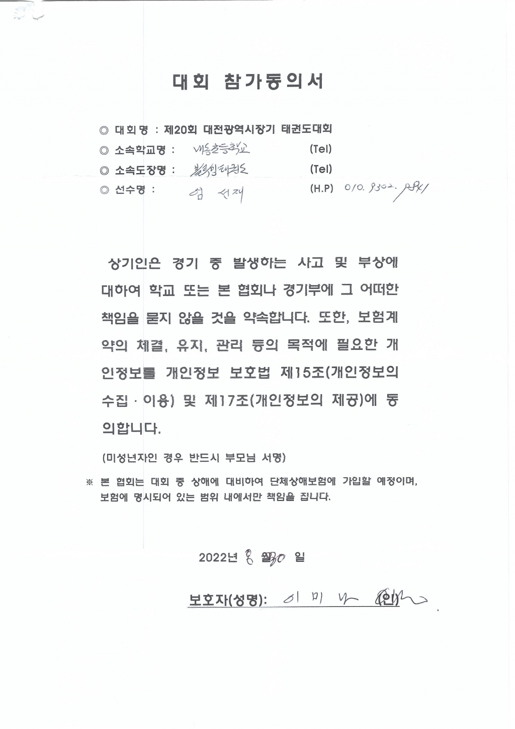 용인대다사랑태권도 대전시장기대회 참가동의서입니다. l image