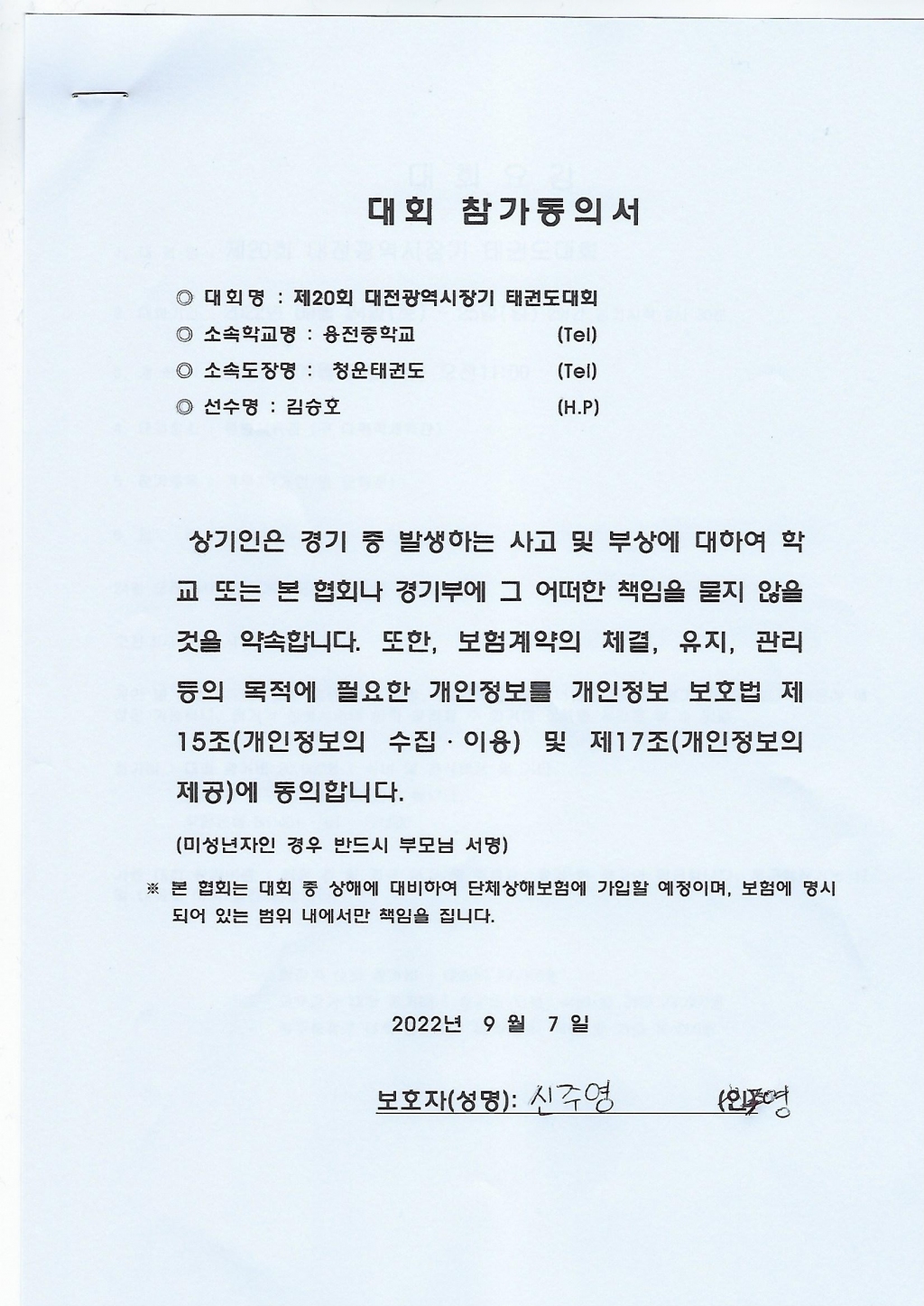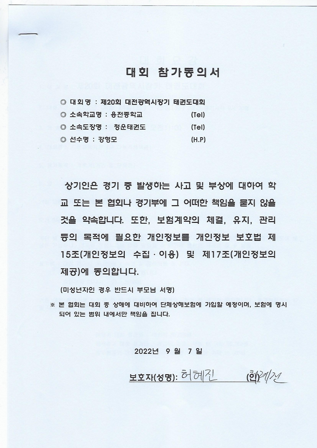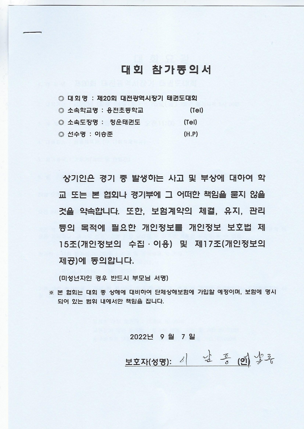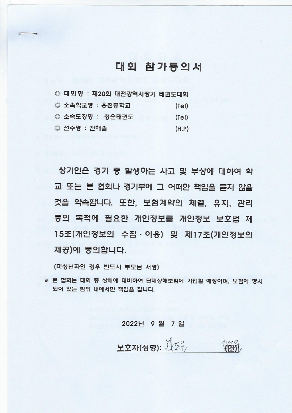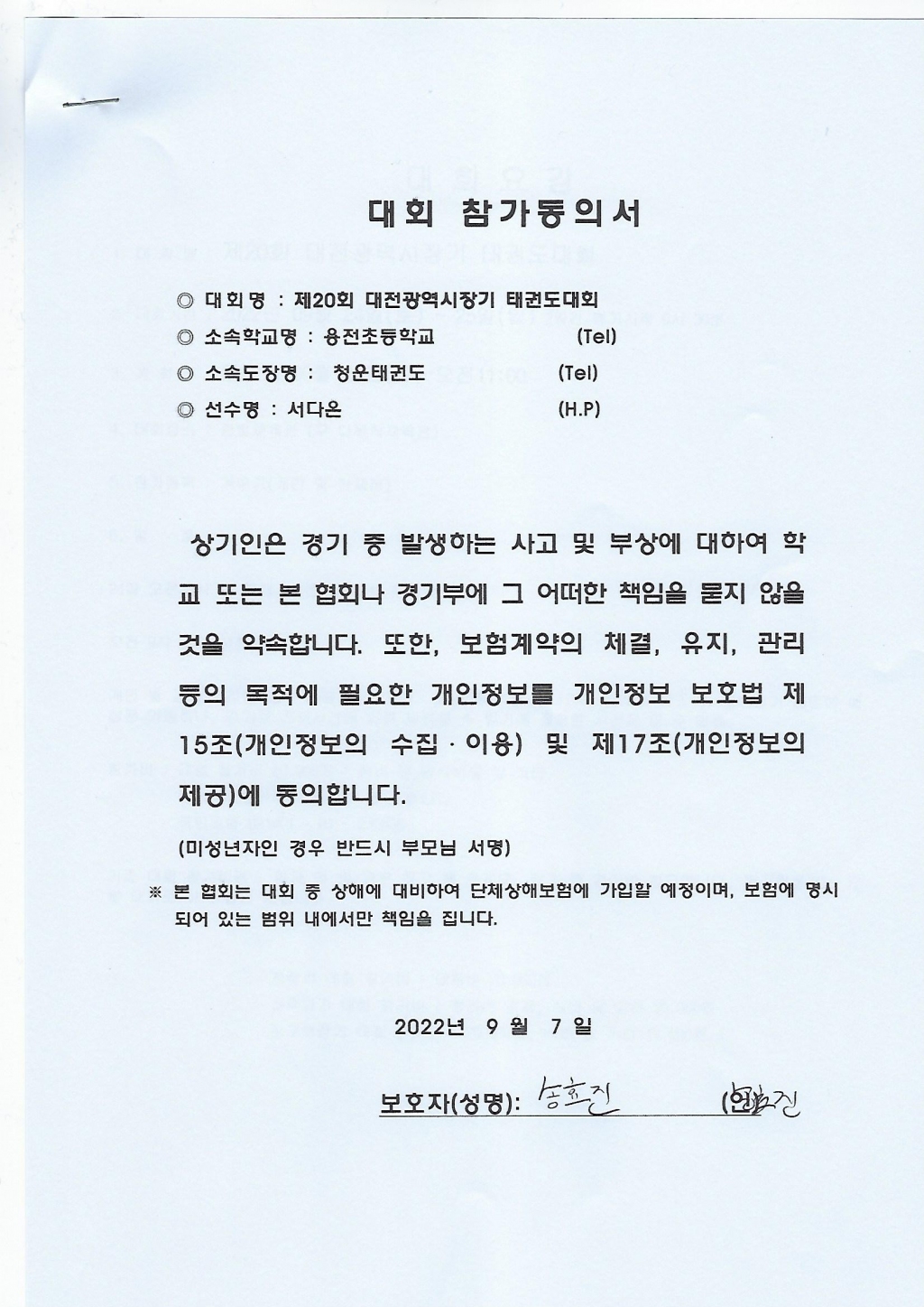 | 494 | 용인대다사랑태권도 대전시장기대회 참가동의서입니다. l image | 용인대 다사랑태권도 | 14 | 2022년 9월 7일 |