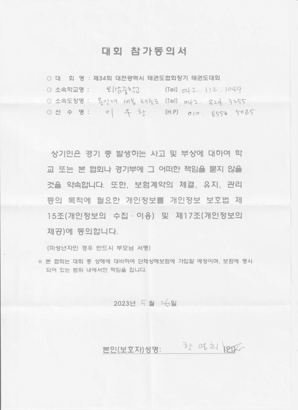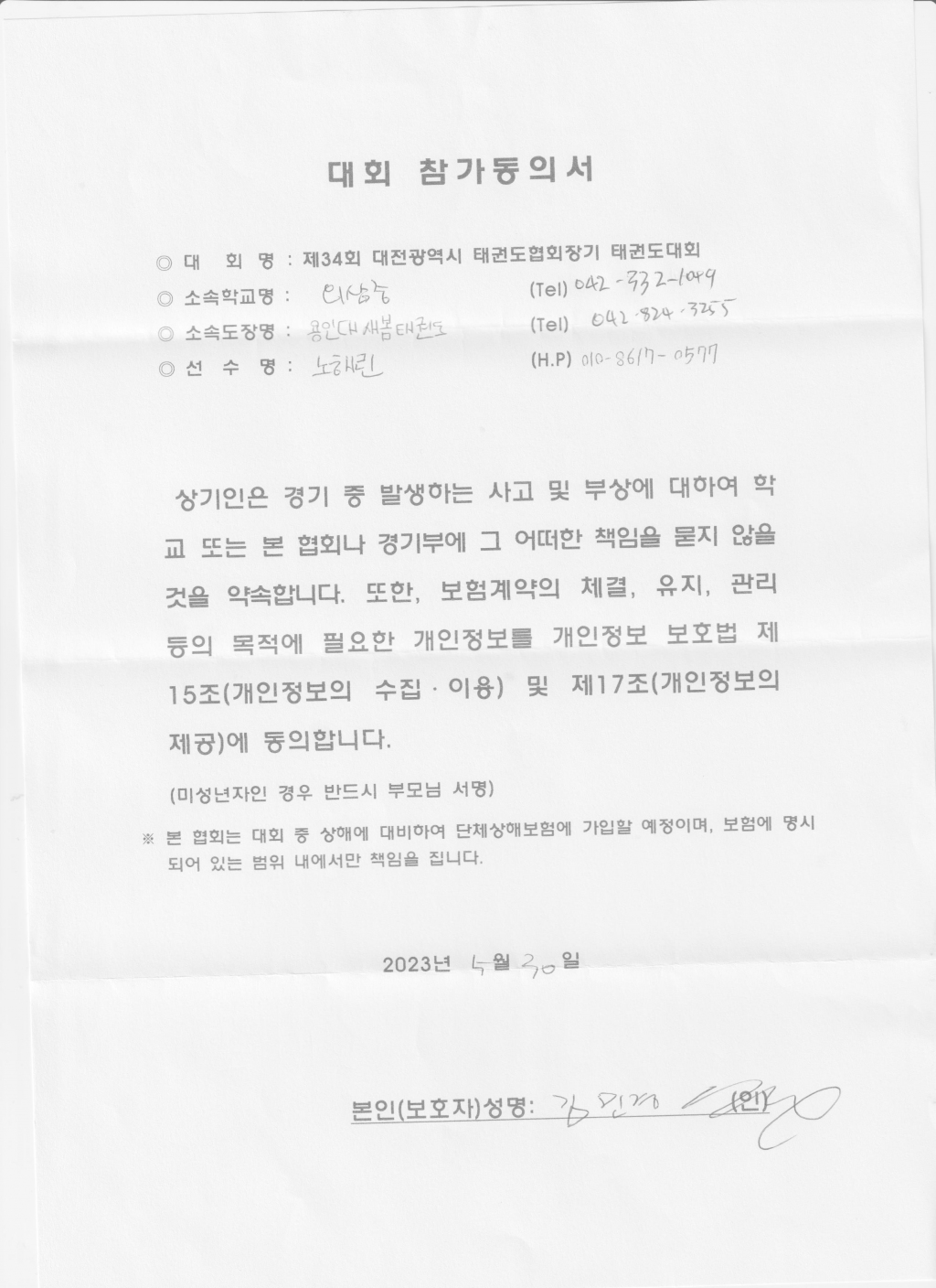 | 612 | 한울태권도장 학부모 동의서 l c | 한울태권도 지족관 | 10 | 2023년 6월 7일 |