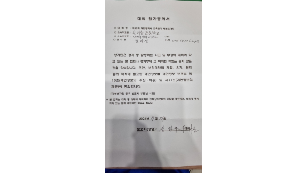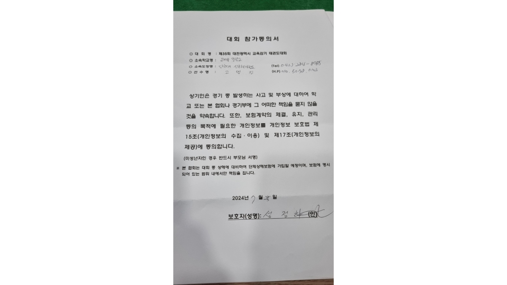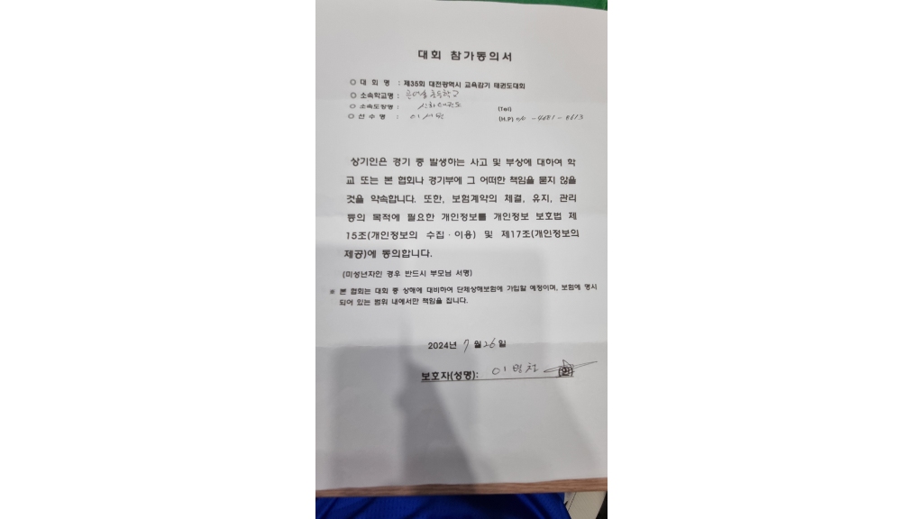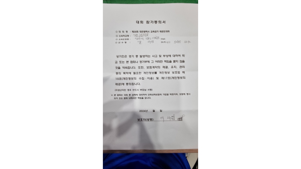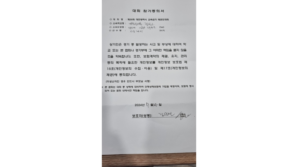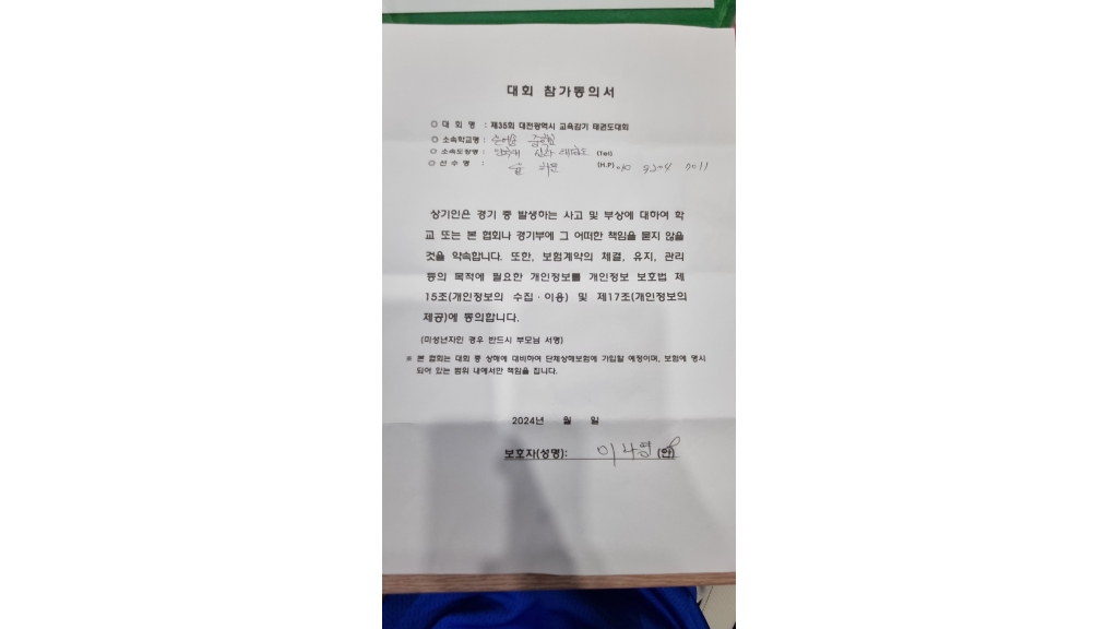 한국체대 석사태권도장 학부모동의서 입니다. l image